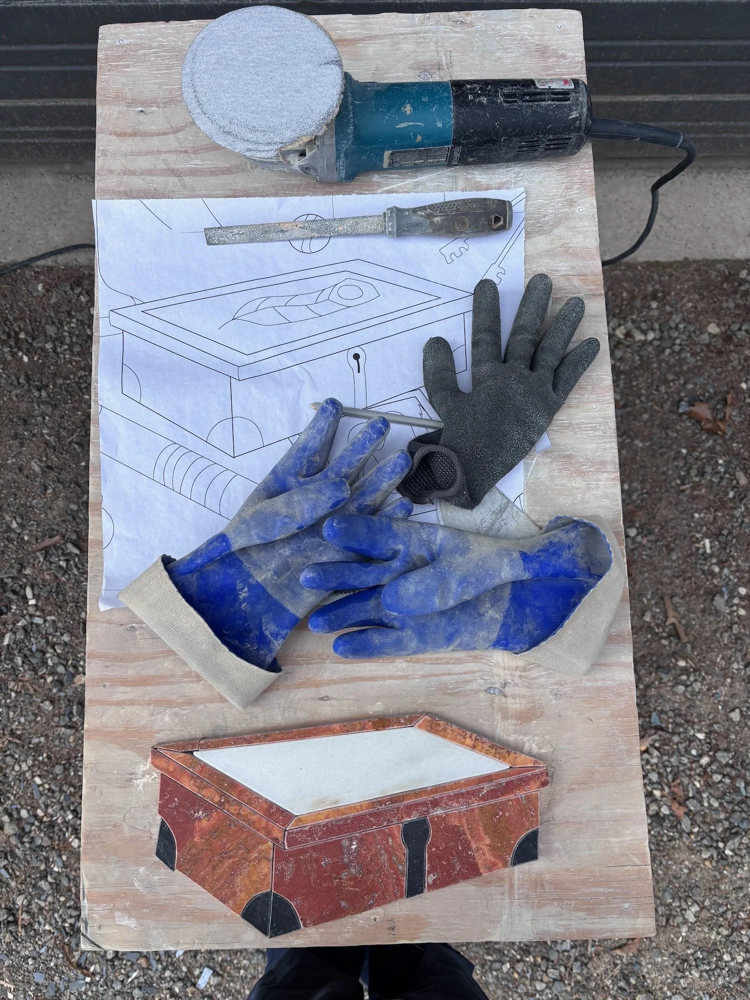 It was a slow week, super cold here. The shop has spot heaters, but even so… Almost all of the cutting is done on a wet saw. I wear the blue rubber gloves over a pair of lightweight cotton gardening gloves. It’s surprisingly warm, since it keeps my hands dry. Wet hands are rough when it’s 35º.