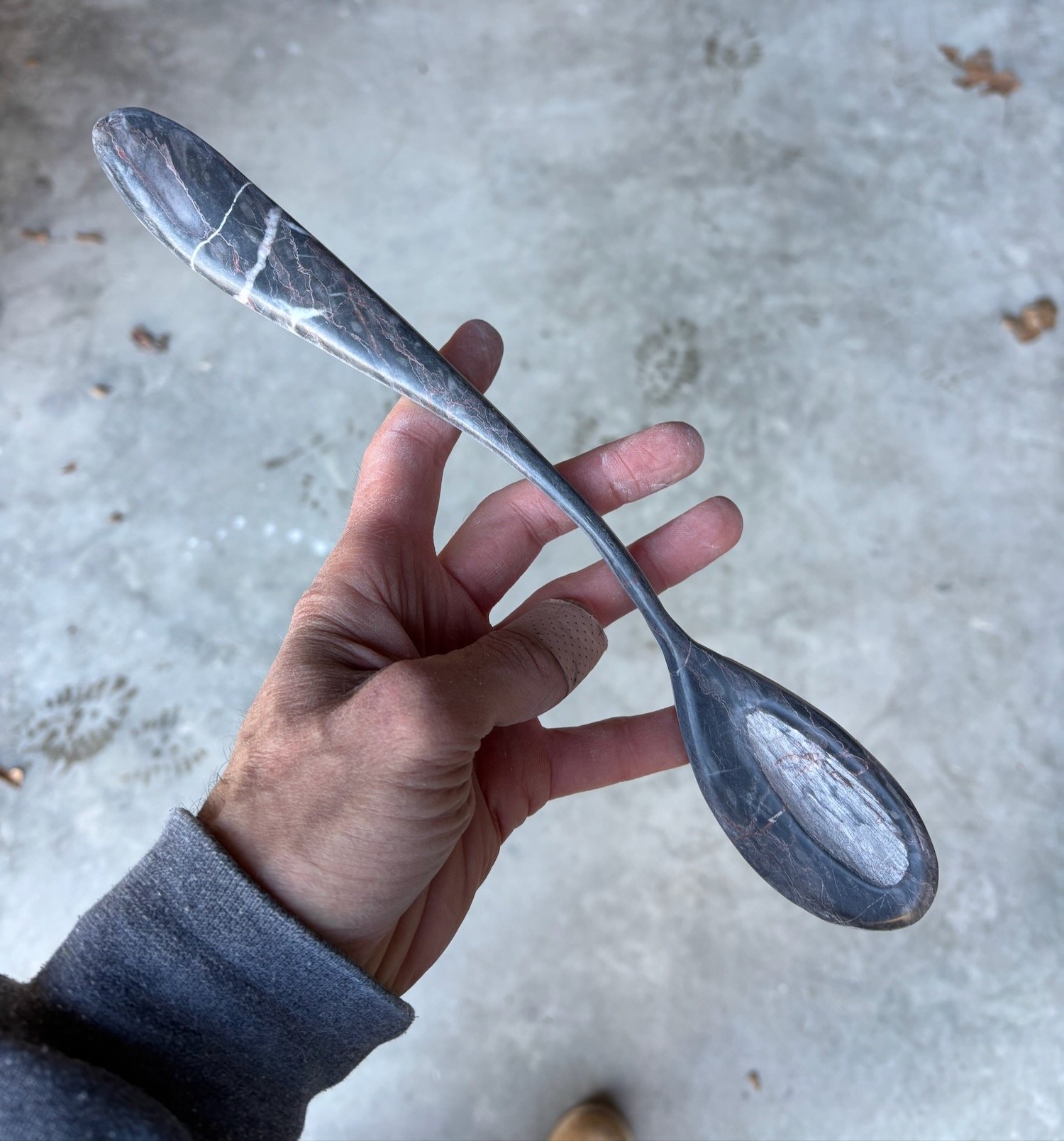 Most of the items on the table have some part of the story, are connected to the Muses in some way. But this is just a spoon, because there’s always a spoon on the table. I got this piece of stone maybe 15 years ago from a guy in Tennessee. He was selling off the contents of his studio. He was a sculptor and made countertops too. I got the sense that he wanted to be done with it, but maybe was having trouble slipping free. He let me wander his yard and grab the odds and ends that interested me. He charged me almost nothing for it all and I still have a lot of the pieces. I know nothing about this stone or where it came from. It resembles a marble from Turkey in one of my books.