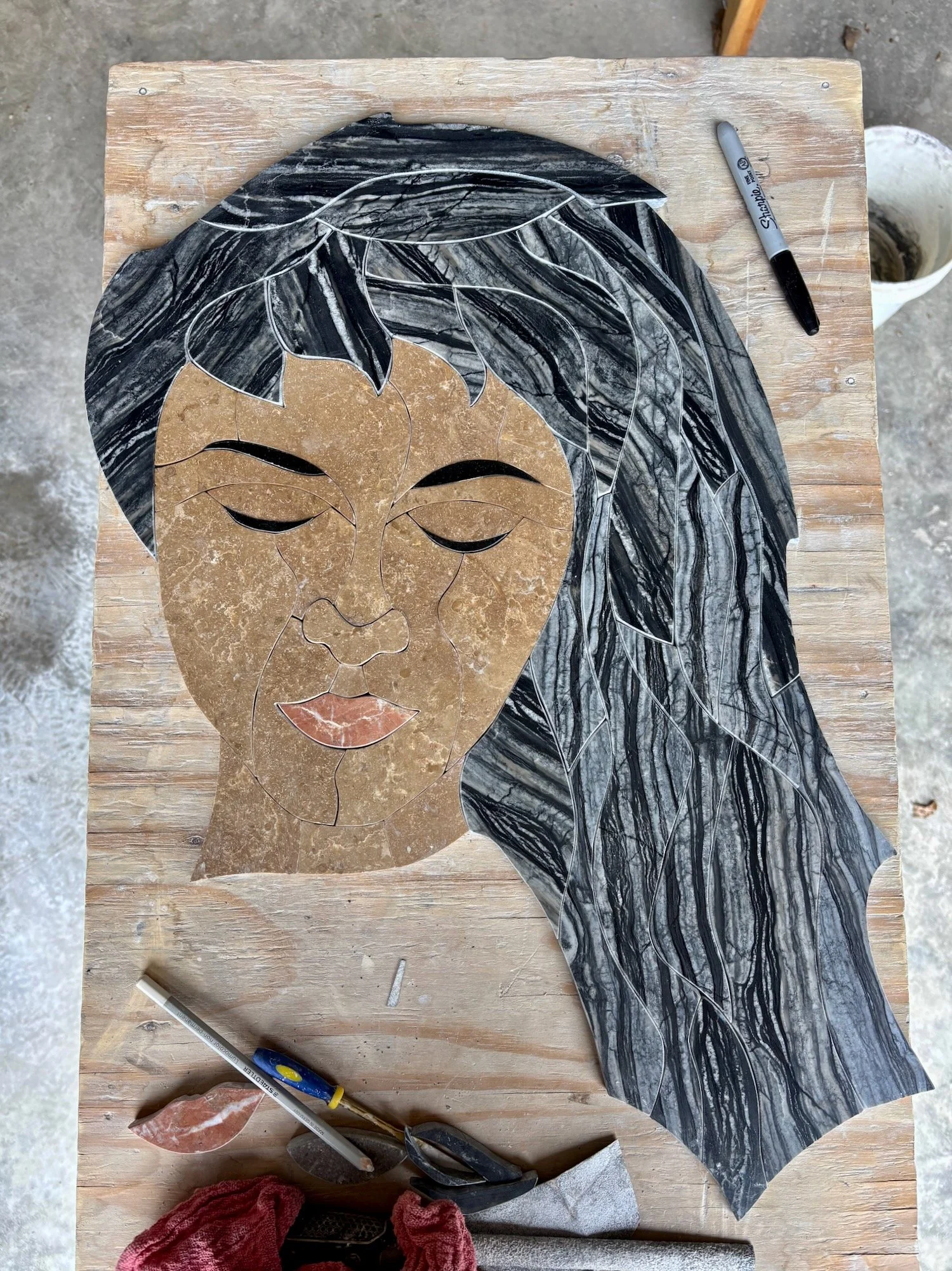 Her face is made of travertine, her hair a marble called Silver Wave. Still some detailing to go, but almost there. This is the second of faces that I have completely done over. That’s not a great track record, since I’ve only done three so far. I hope to be more on point in the future. I start with an idea and I chase it and it doesn’t work out. It’s all learning. Sometimes though, learning is super inefficient and wastes stone…